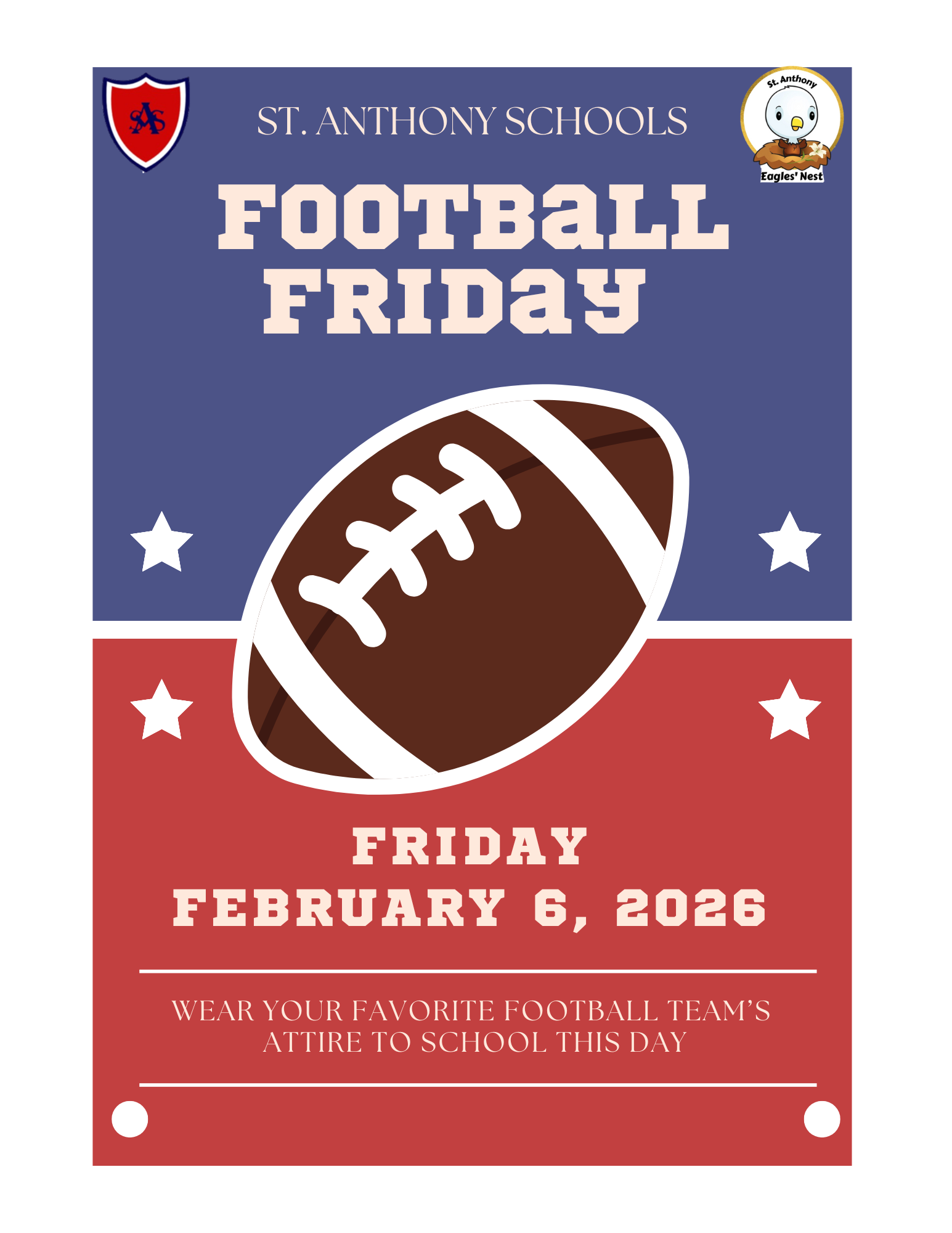 Friday: Eagles' Nest spirit shirt with jeans or parent-approved bottoms.